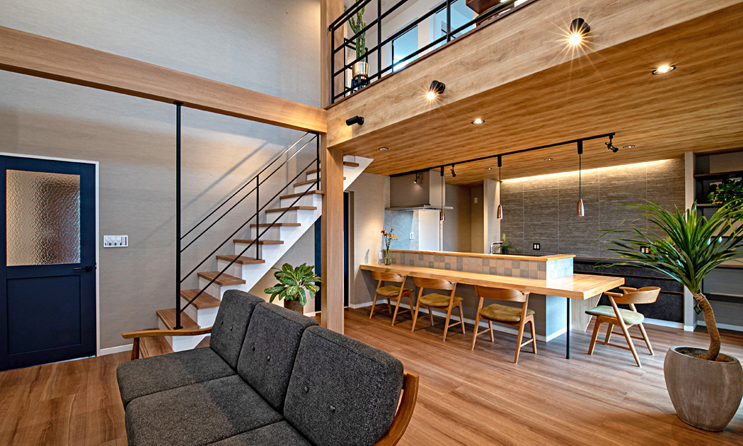 家族との繋がりをいつも感じられる仕掛けのひとつが大きな吹き抜けです。開放感はもちろん、大きな傘のように家族がひとつ屋根の下に暮らしている実感を与えてくれます。