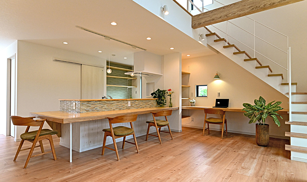 無駄な余白はつくらない。シンプルでミニマルな暮らしができるZEH住宅をご希望のお施主様。かねてからダイニングテーブル不要論のご夫婦の発案により食卓は退場し、その代わりにキッチン前に4M、階段下のスタディコーナーに3M、ダブルのロングカウンターを設けたユニークなライフスタイルの住宅です。