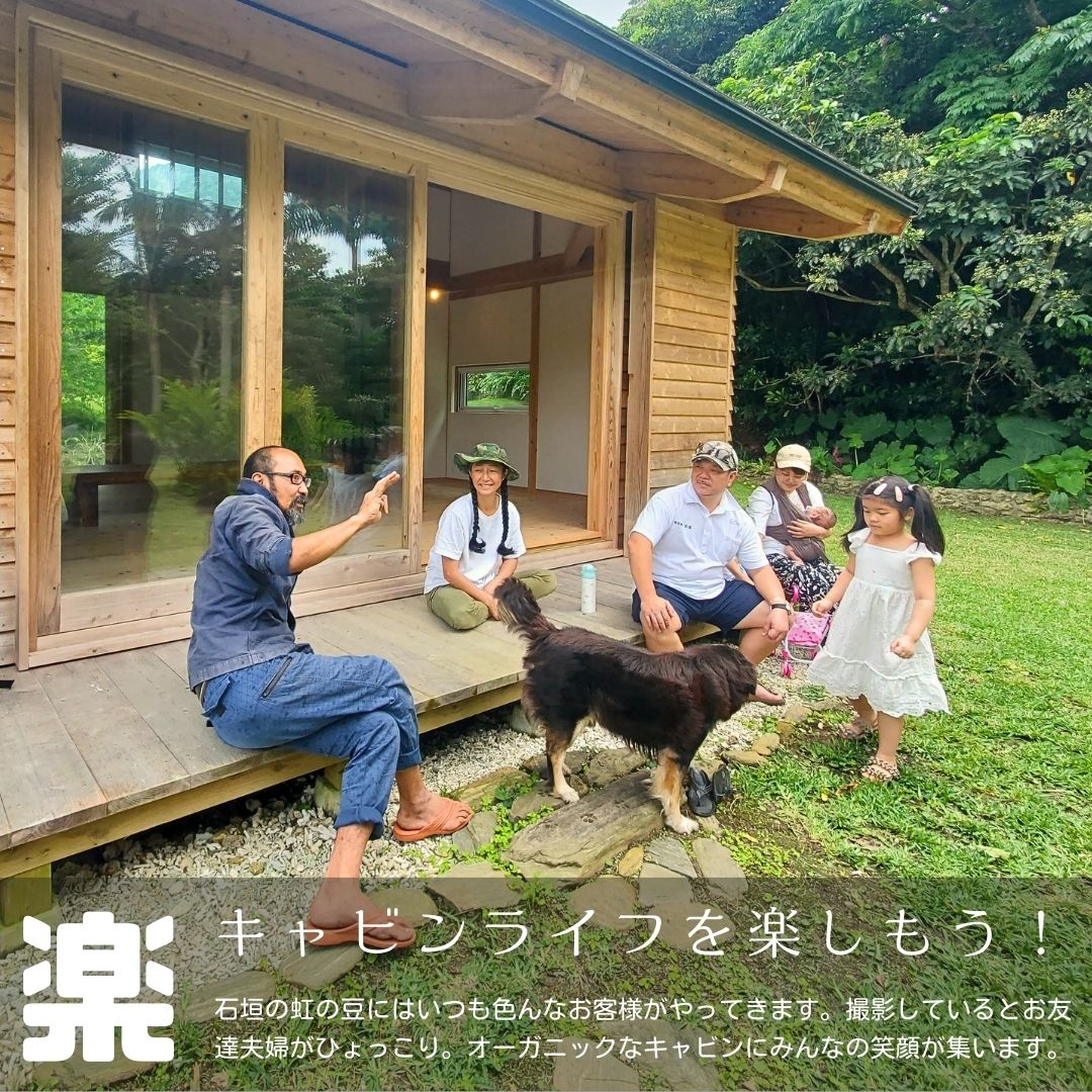 石垣の美しい海岸線からせり上がる、雄大な山々に抱かれた隠れ里のような場所に「ネイチャーロッジ虹の豆」はあります。女優で歌手・ナチュラリストとして活動する高樹沙耶さんからお声かけ頂いたところから別棟のスタジオ計画が始まりました。