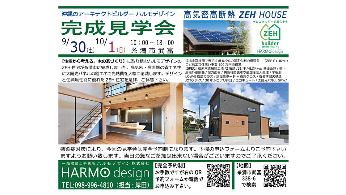 今週末は糸満市武富にあるZEH住宅の完成見学会を行います。これから新築をご検討している方、ZEH住宅に興味のある方は是非、ご来場ください。