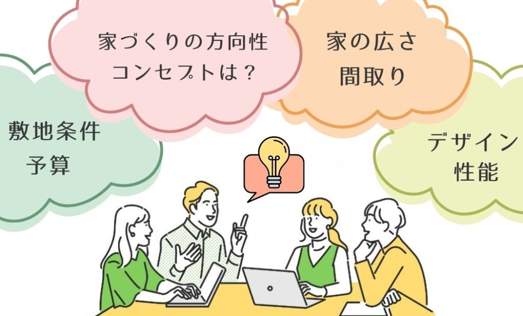 家族構成、理想のプランやデザイン、予算の話をヒアリングさせて頂き、お客様が大切にしたい家づくりのポイントを整理しながら、理想の住まい像を見つけます。