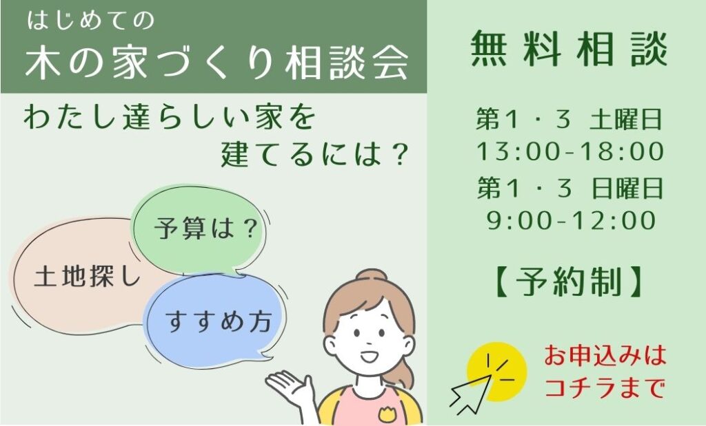 毎月第1・3週の土曜日は13:00-18:00、日曜日は9:00-12:00まで、【はじめての木の家づくり 無料相談会】を開催中です。お手数をおかけしますが、相談会の予約フォームにお申込みをお願いいたします。