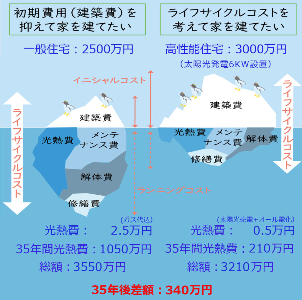 そのためには、【ライフサイクルコスト】(住宅ローン=建築時の費用と生涯にかかる光熱費とメンテナンス費用の合計)を建築当初から想定し、毎月の生活の収支が合うか事前に検討しておく必要があります。