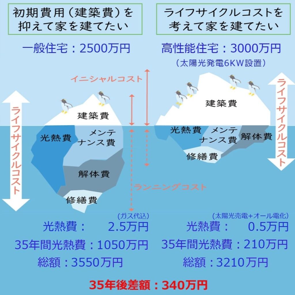 高性能住宅は、その優れた省エネ性により、一般住宅と比較して試算では、35年間で光熱費に340万円の差がでます。昨今の光熱費の上昇を考えると、新築時に性能向上分の費用はかかりますが、長期的視点で考えると将来のリスクを減らすことができる優れた選択といえるでしょう。