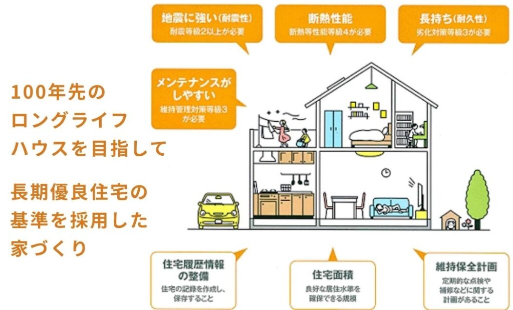 長期優良住宅の基準の中で特に、1)劣化対策等級と、2)維持管理、3)耐震性、4)省エネ性の項目が重要になります。国が策定したこれらの項目を遵守することにより、長期にわたって良好な状態を保つことのできる住宅になります。