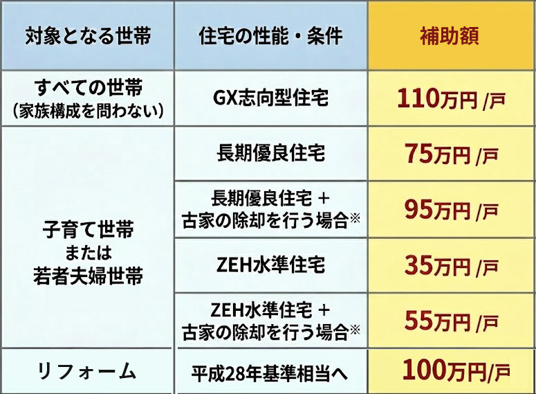 高性能な「GX志向型住宅」では、最大110万円という最も高い補助額が設定されています。